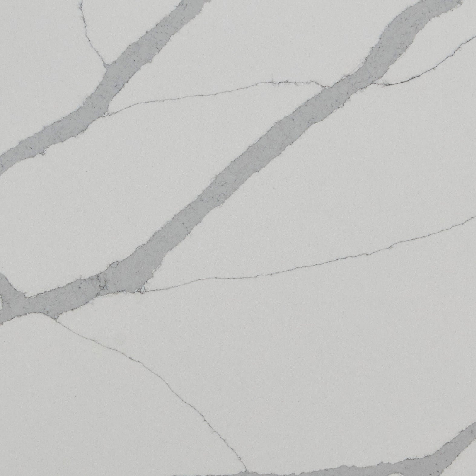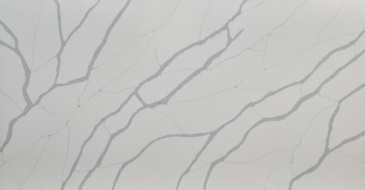 Dramatic veins flow throughout the striking Calacatta Sierra Quartz, offering a marble-like aesthetic with quiet sophistication. Neutral and cool tones are woven throughout the slab as thick gray veins in a diagonal interconnect with thin veins, giving the white quartz background a balanced and symmetrical look. Create eye-catching countertops, backsplashes, or kitchen islands with Calacatta Sierra. The product is durable, easy to clean, and virtually maintenance-free and is ideal for a range of architectural design styles in both homes and commercial properties.