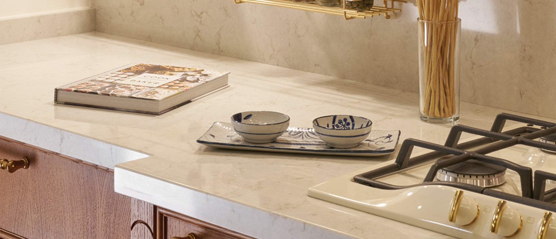 Cashmere Taj features a soft, creamy background and bronze and gold Carrara veining, evoking the look of natural stone. Chic and sophisticated, this gorgeous, on-trend quartz is strong, durable, and easy to maintain, making it the perfect addition to residential and commercial spaces. Use this attractive surface solution to create beautiful countertops, waterfall islands, and accent walls. Additionally, the surface features a high-gloss polished finish, enhancing the quartz’s luxuriously soft coloration and shine.