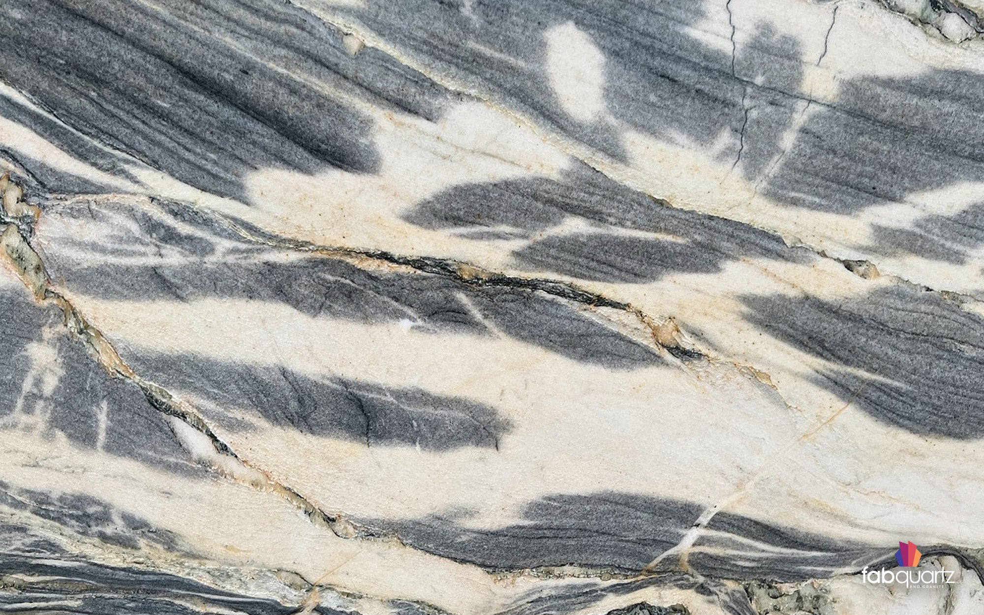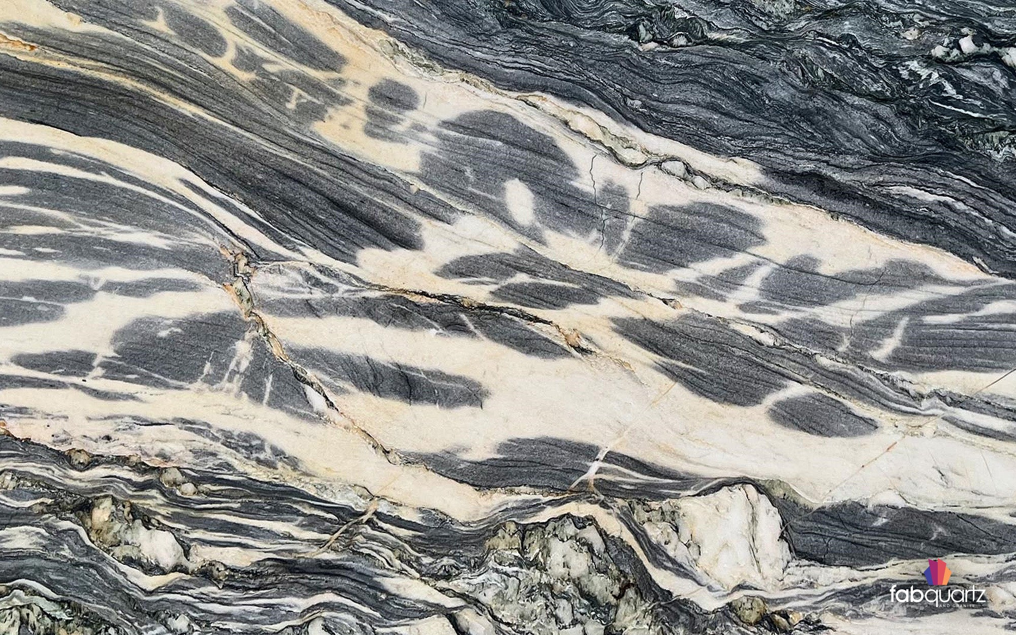 Ocean Fantasy quartzite features turbulent waves of alternating black, white, gold and green with pockets of white crystals. Elevate your custom quartzite countertops, backsplashes, showers or floors with high quality surfaces by FabQuartz. Call to talk with a natural stone design expert today.