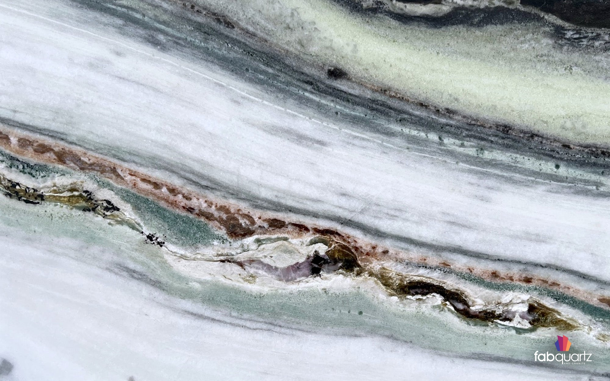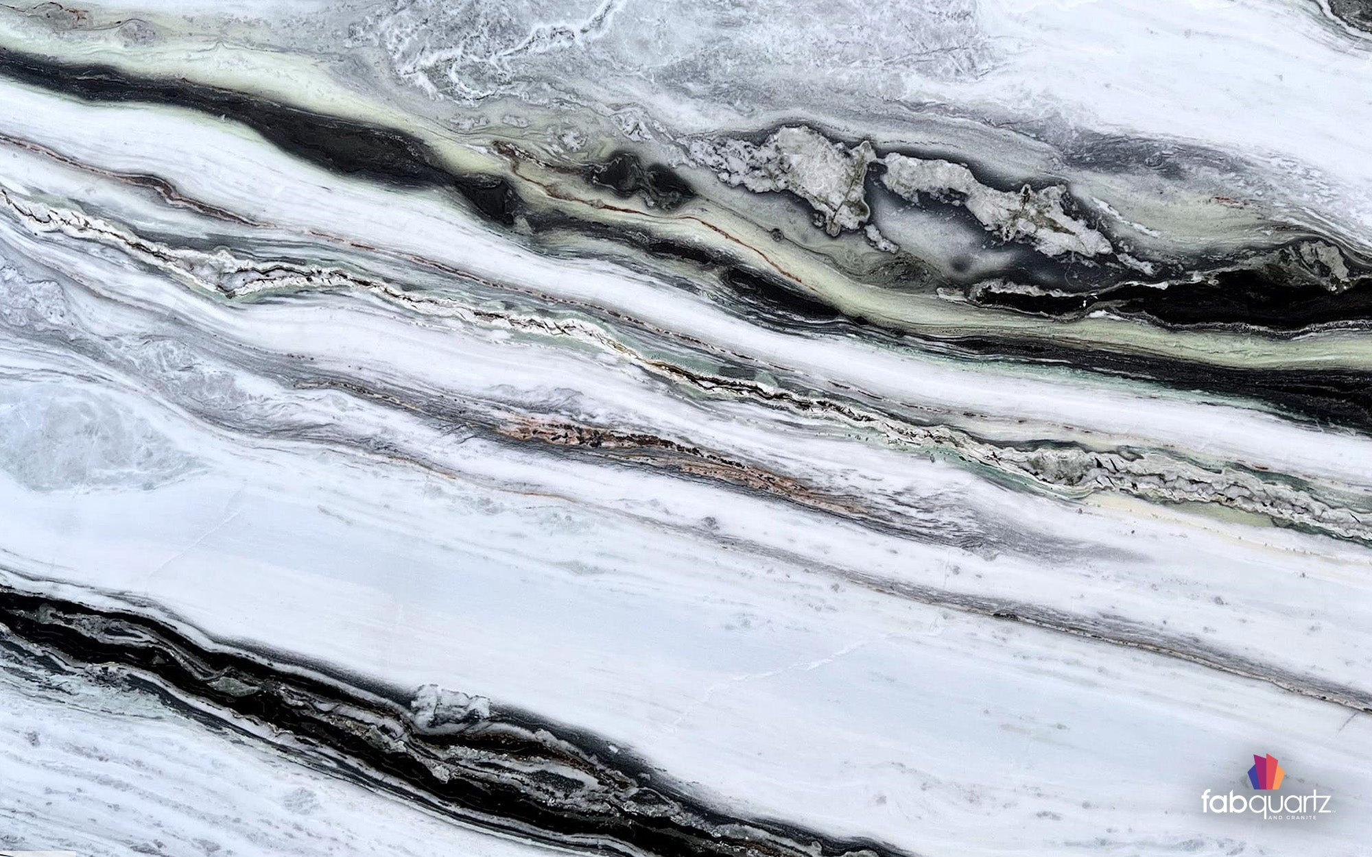 Panda dolomite features smooth black and white waves with subtle ocean tones and pockets of white crystals. Panda illuminates brilliantly when used for backlit countertops or accent walls. Elevate your custom dolomite countertops, backsplashes, showers or floors with high quality surfaces by FabQuartz. Call to talk with a natural stone design expert today.