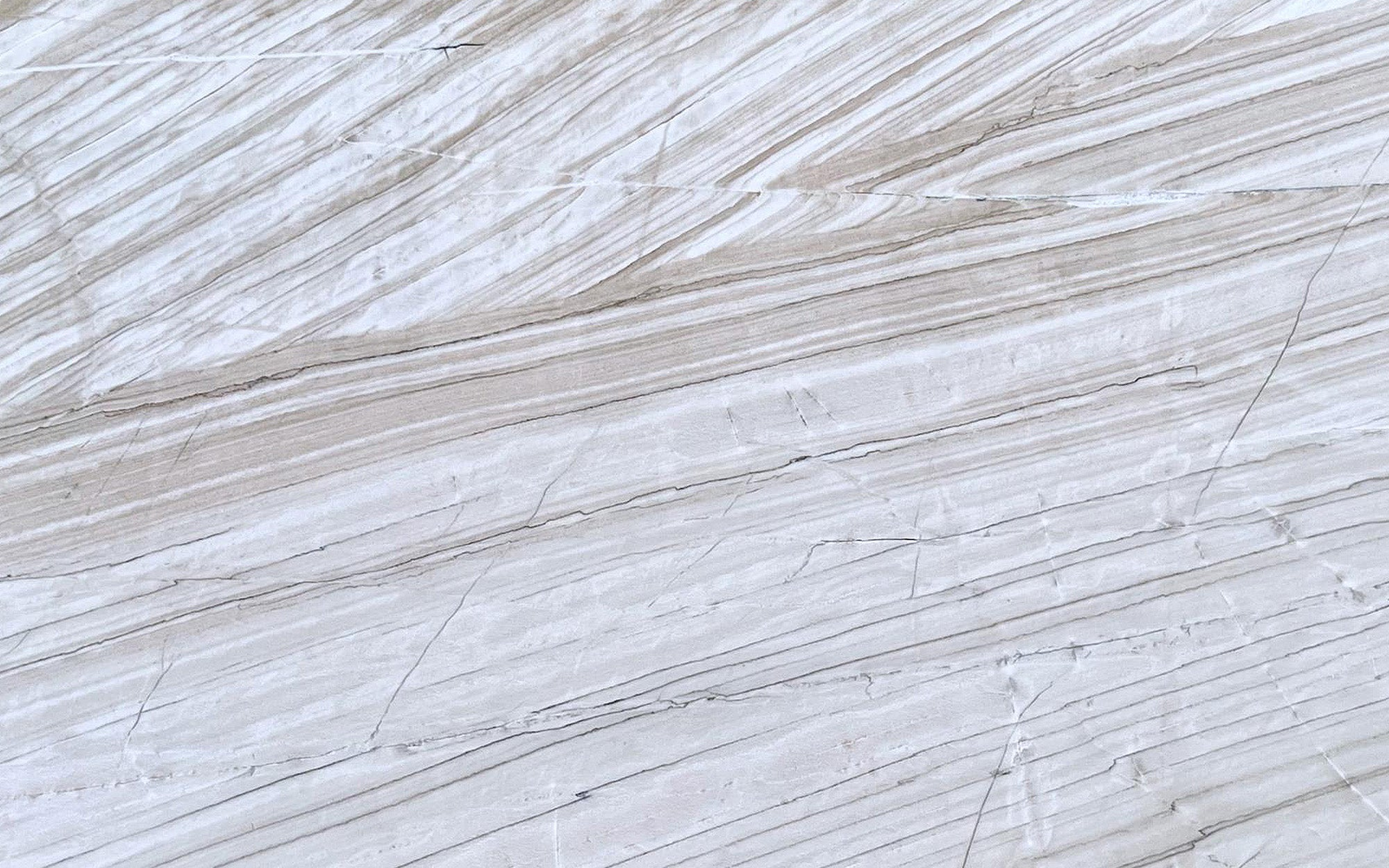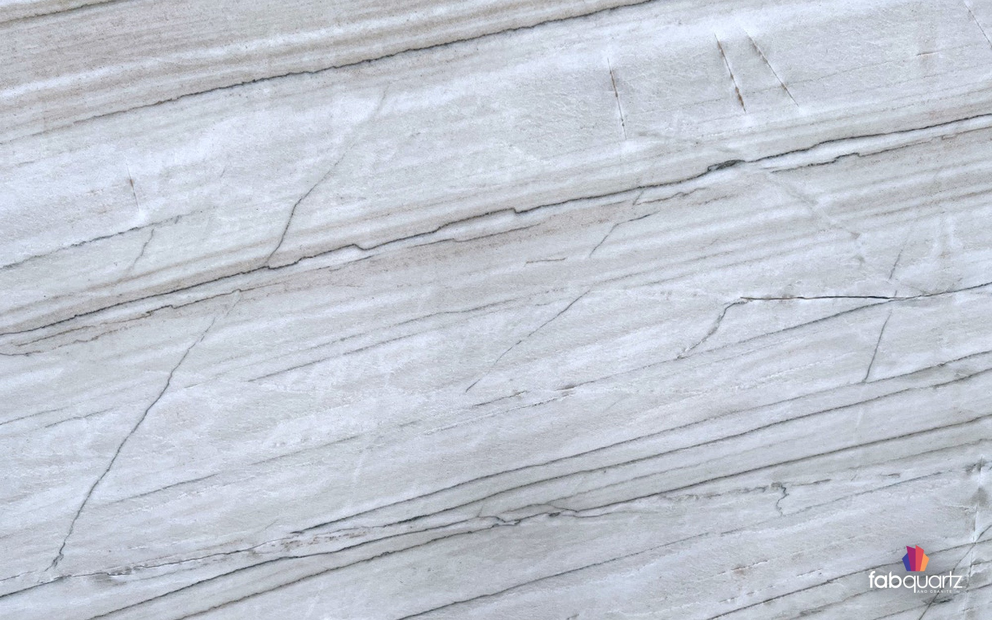 White Lux quartzite features waves of cool grey and light brown interspersed with thin dark lines. Elevate your living spaces with custom quartzite countertops, backsplashes, floors and fireplace surrounds by FabQuartz. Call to talk with a natural stone design expert today.